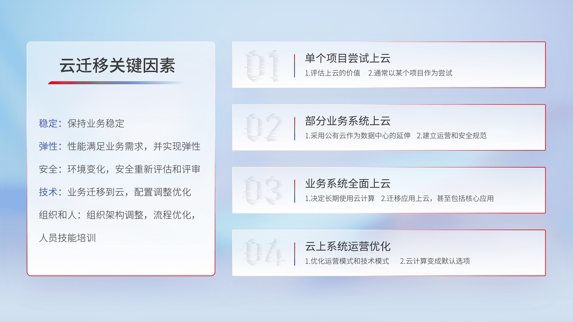 结合实际业务,,,从规划设计、、、云平台选型、、、云原生改造、、、数据迁移、、、、集成交付,,,,迁移全过程为客户识别最佳上云路径,,,,做好风险识别管理,,,,设计网络架构、、、身份权限、、、安全审计合规、、、操作审计、、、、日志审计、、监控告警策略、、、多站点容灾设计等,,,对云上基础设施进行整体规划,,,,提升IT治理水平,,以满足弹性、、、高可用、、高性能的需求。。。