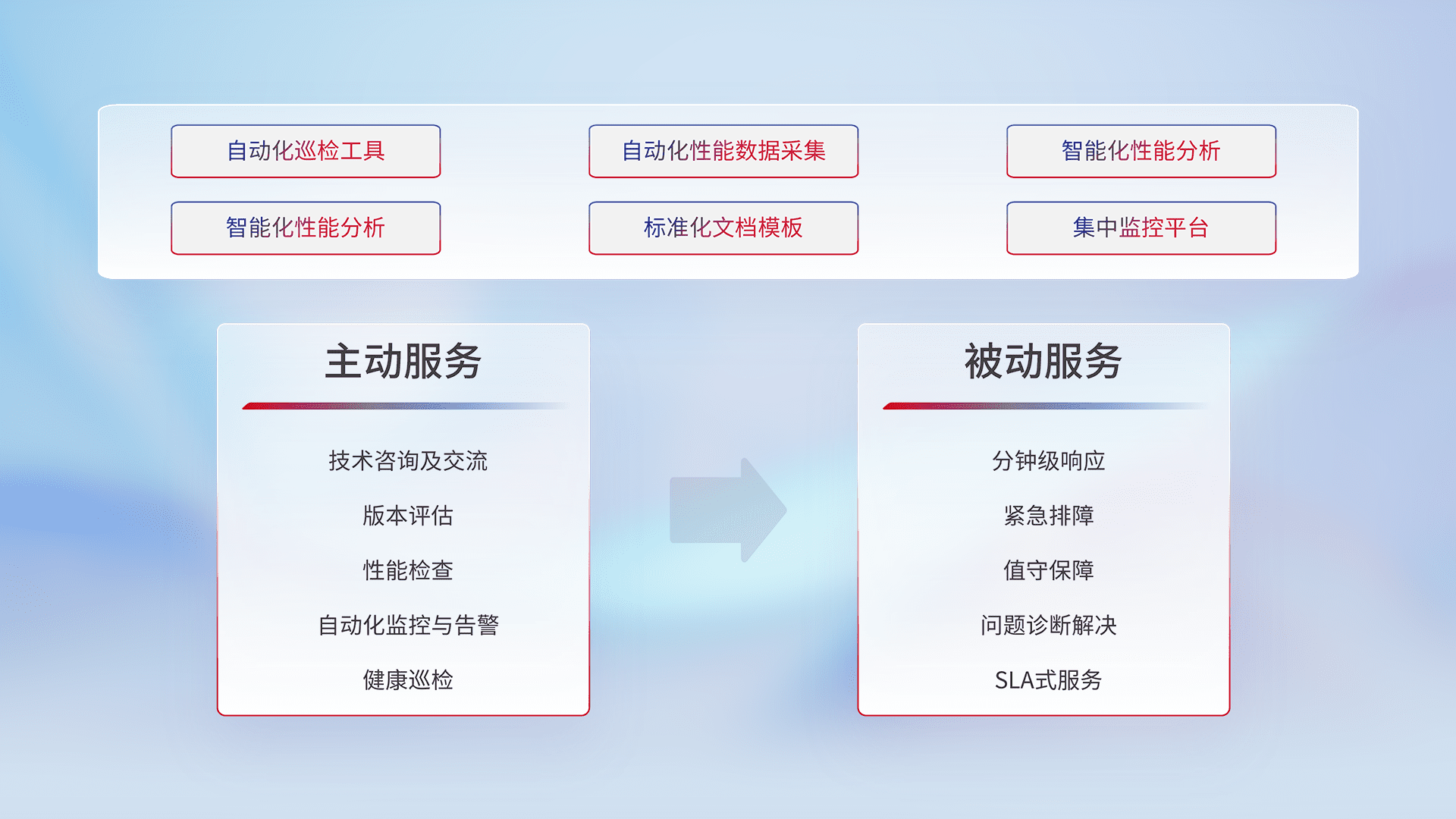 智能化工具和标准化文档,,,保障服务质量,,,,提供主动服务(包含技术咨询、、、、版本评估、、、、性能检查、、、自动化监控与告警、、健康巡检)和被动服务包含(分钟级响应、、、、紧急排障、、、值守保障、、问题诊断解决、、SLA服务)。。。